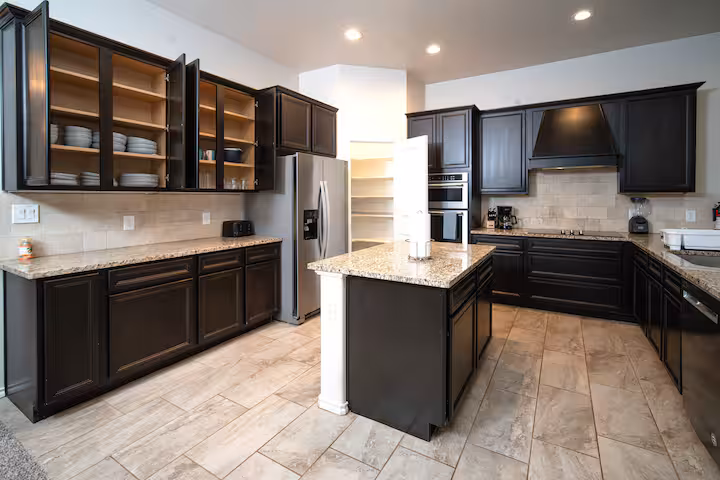 Large open concept living area, a stylish dining room, fully stocked large kitchen with two islands. Four bedrooms, each with 2 full-size beds. Home is in a cull-de-sac.